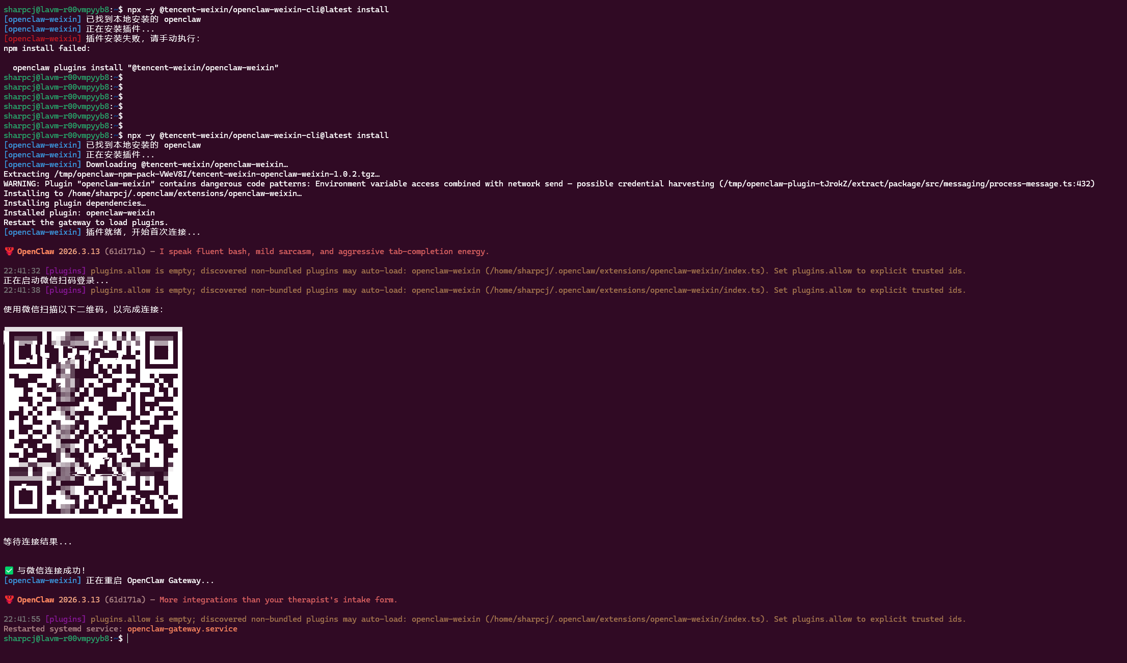 然后再你的服务器上安装微信的 OpenClaw 插件: