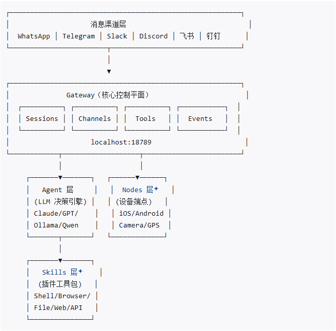 - Skills: JS/TS 可扩展工具包,支持 Shell 命令、文件操作、浏览器控制等