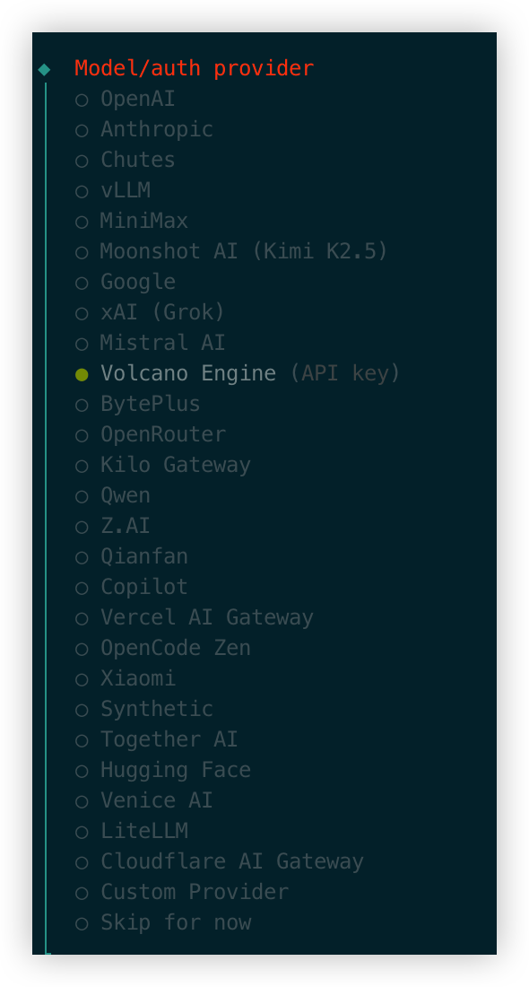 模型配置需要根据实际情况进行选择配置: 我这里使用火山引擎的模型,选择 Volcano Engine