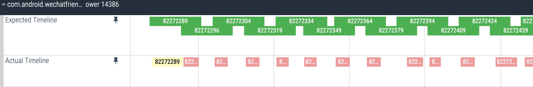 Perfetto 相比 Systrace 的一个重要优势是提供了 FrameTimeline 功能,可以一眼就可以看到卡顿的地方。需要 Android 12 或者更高版本支持。 当帧在屏幕上的实际呈现时间与调度器预期的呈现时间不匹配时,就会产生卡顿。FrameTimeline 为每个有帧在屏幕上显示的应用添加了两个新的轨道: